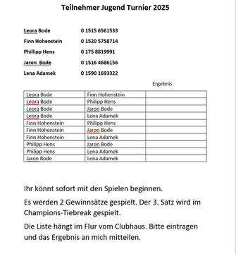 Die Teilnehmer/innen tragen sich bitte in die ausgehängte Liste am Clubhaus ein oder melden sich per Email, info@tceitelborn.de, an.